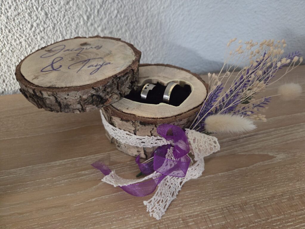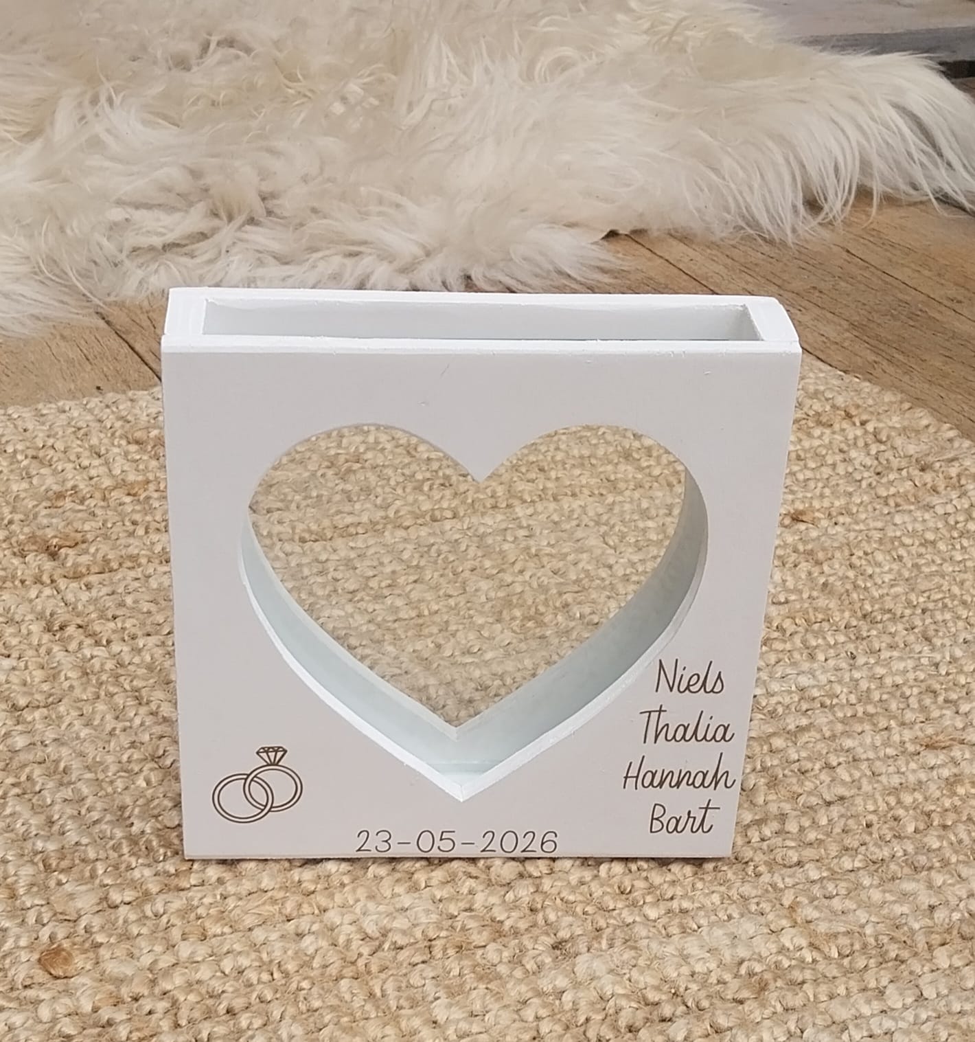 Tijdens een zandceremonie gieten jullie samen gekleurd zand in dit prachtige kader van hout en glas. Door de hartvorm ontstaat er een uniek kunstwerk dat jullie verbintenis symboliseert. Het kader kan gepersonaliseerd worden met jullie trouwdatum, namen of symbolen zoals ringen.